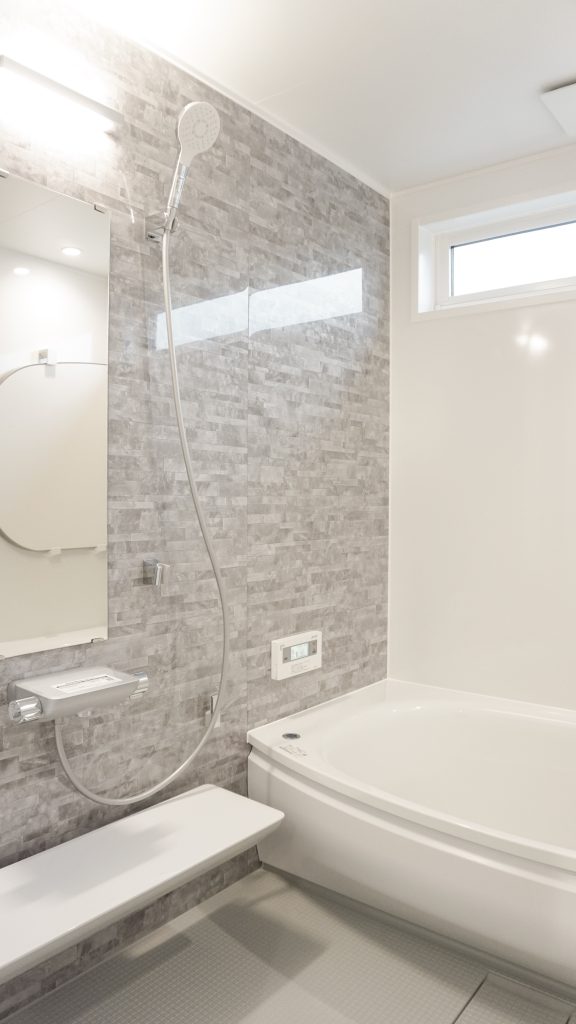 落ち着いたカラーリングのシステムバス。ベージュのカウンターも素敵ですね。